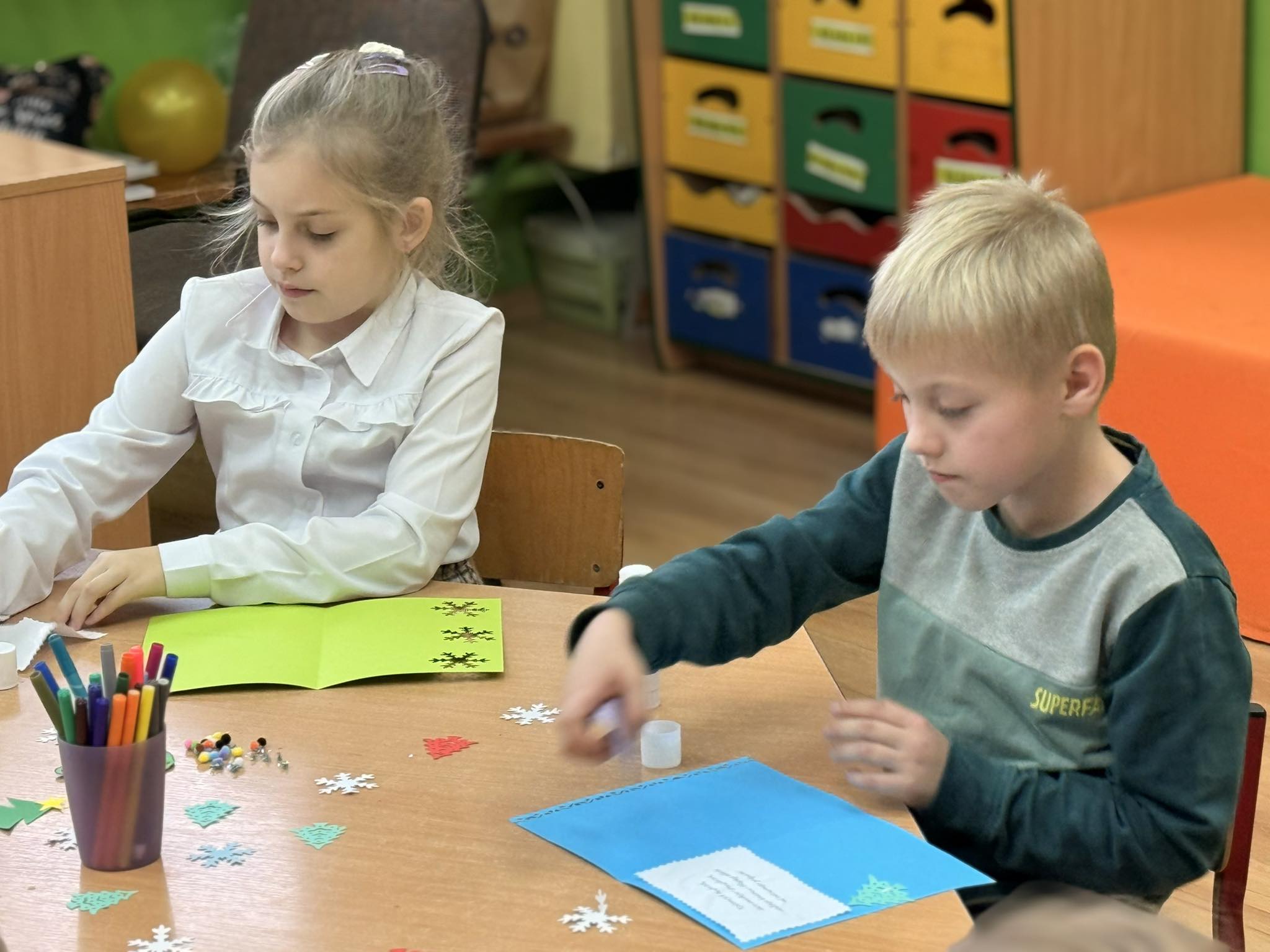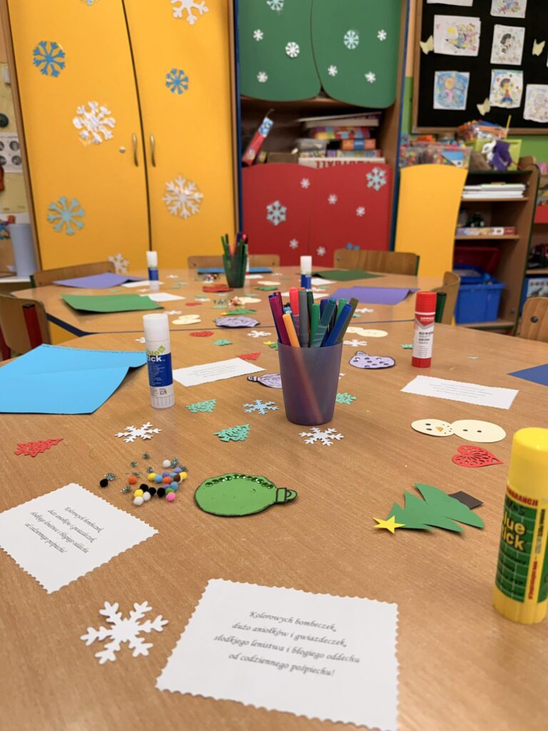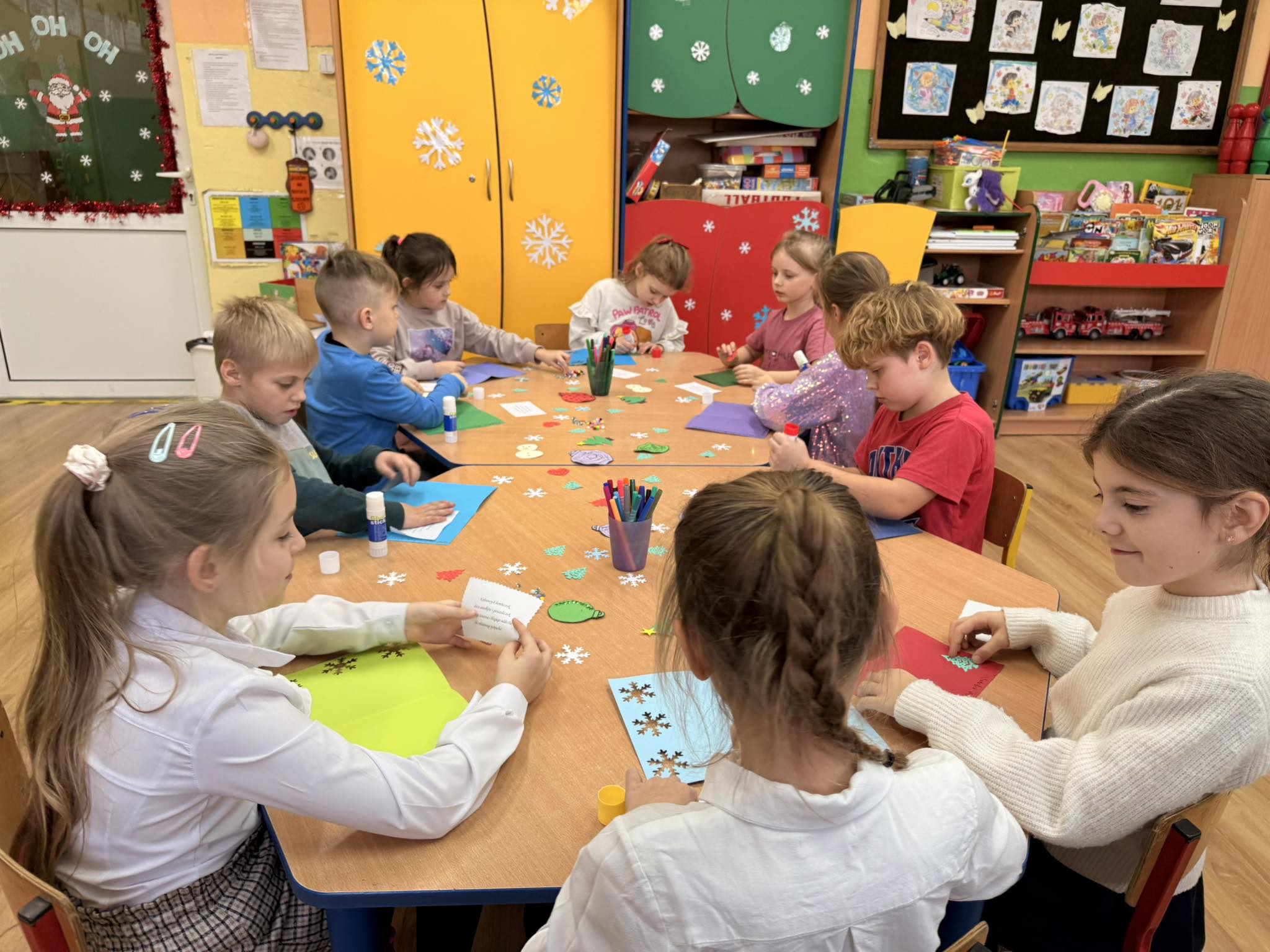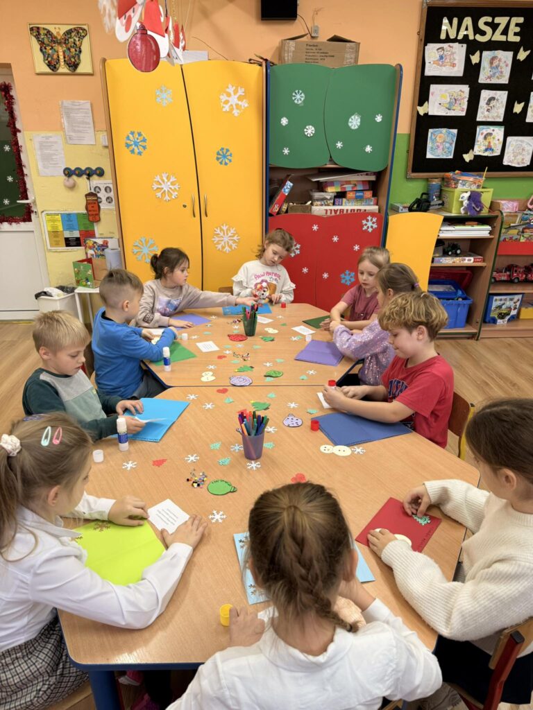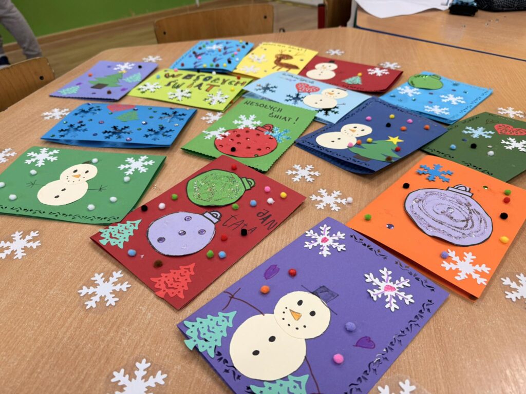 Dzieci z wielkim zaangażowaniem tworzyły kartki świąteczne, które na pewno wywołają uśmiech na twarzach obdarowanych nimi bliskich.😊