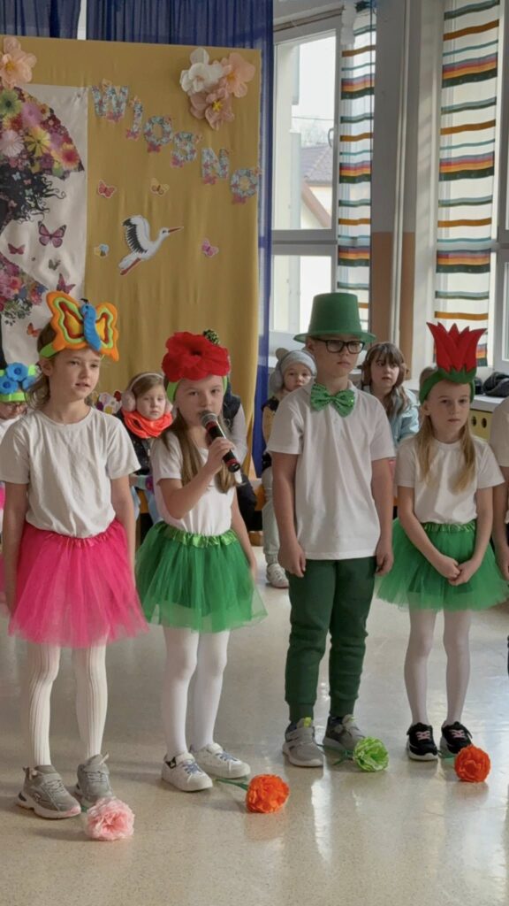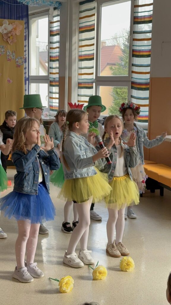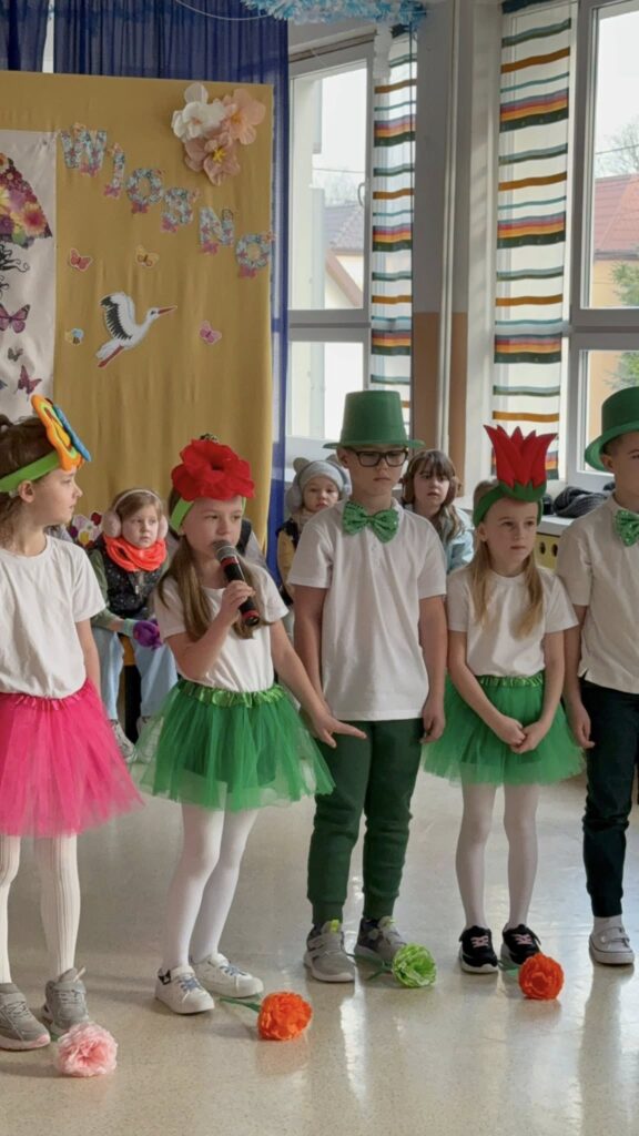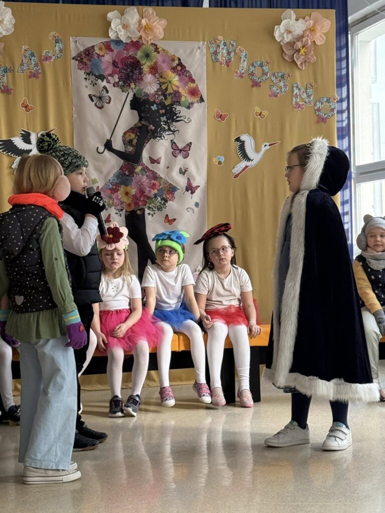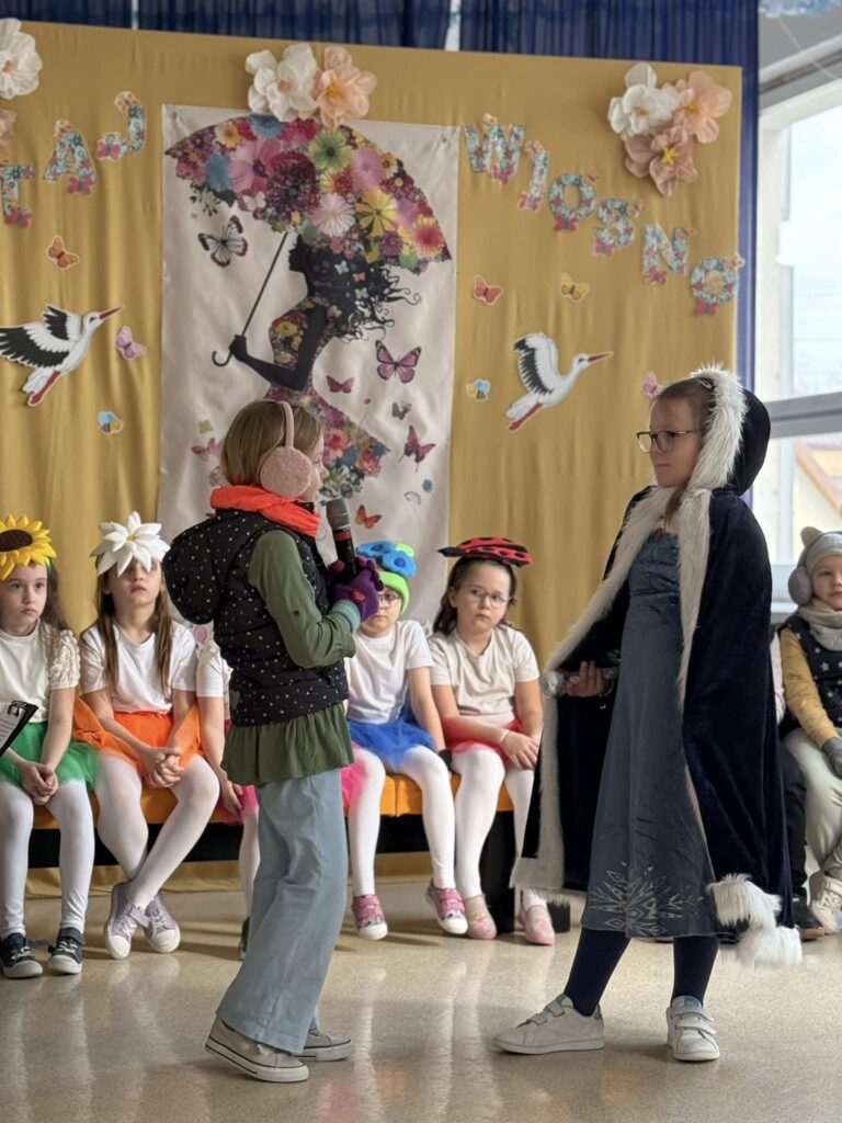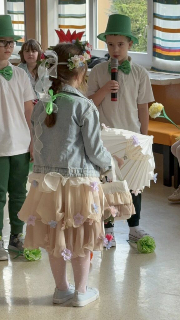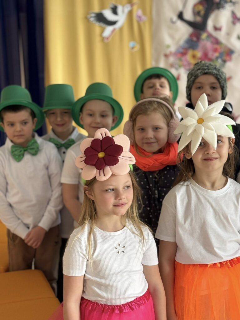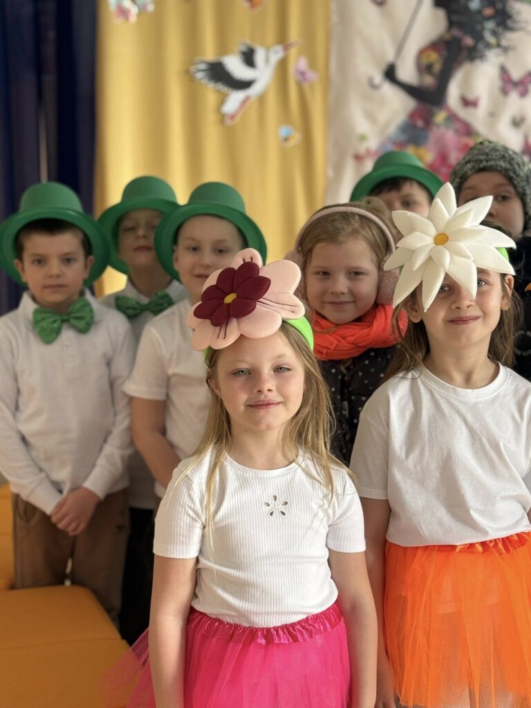 Dzisiejsze spotkanie należało do aktorów z klas pierwszych. Wspaniale zaprezentowali wiersze i piosenki żegnające zimę, a witające wiosnę. Kolorowe stroje, kwiatowe ozdoby i zielone kapelusze dodały wiosennego nastroju młodym aktorom.