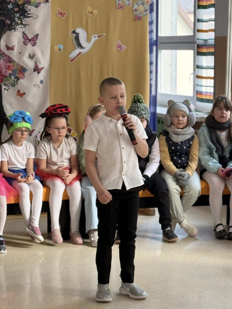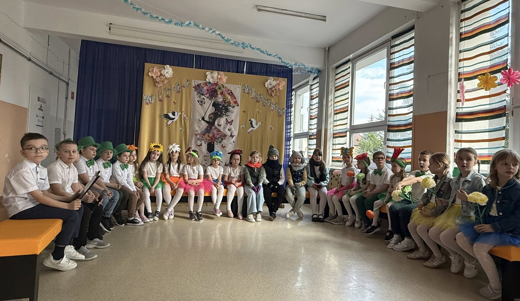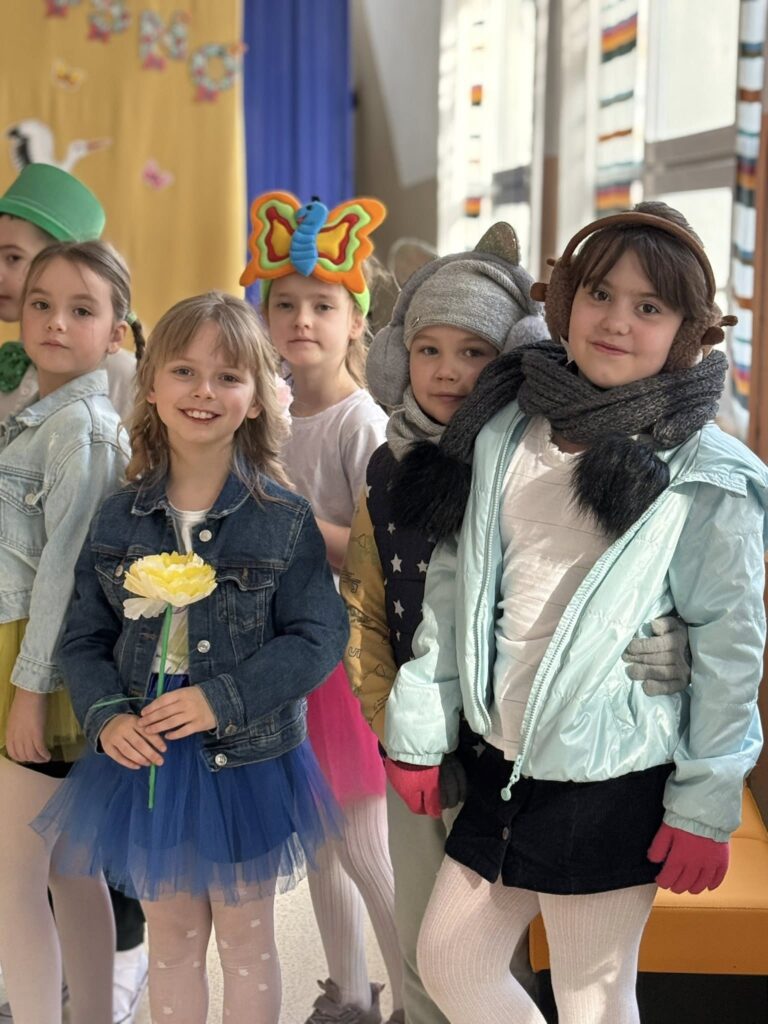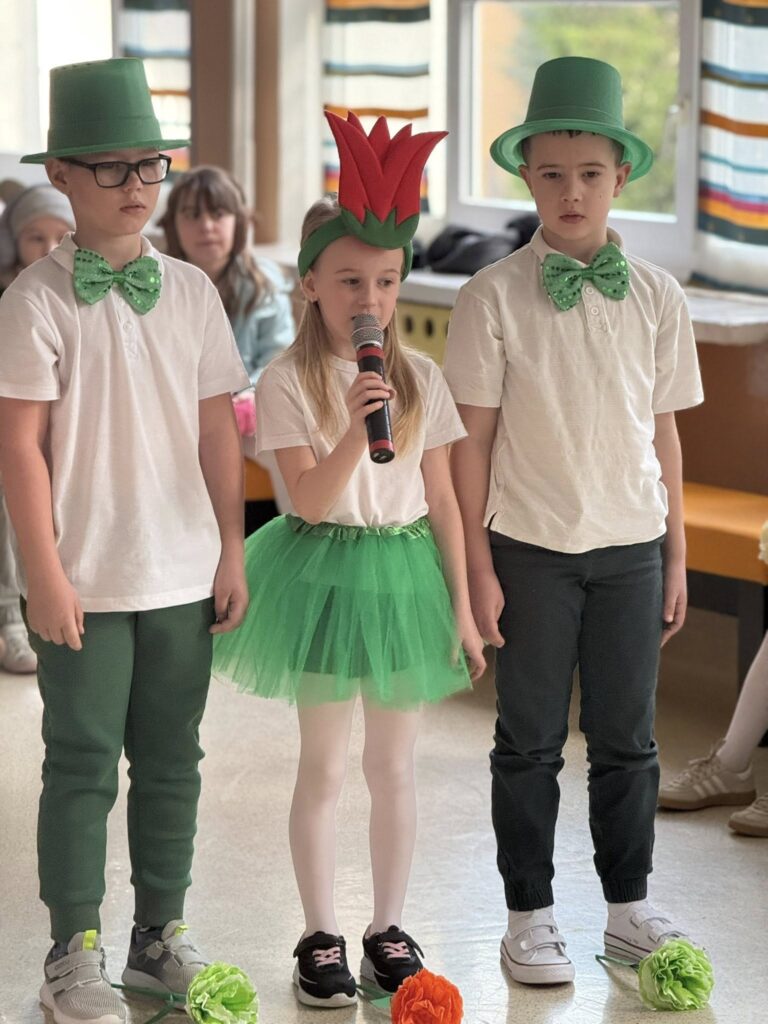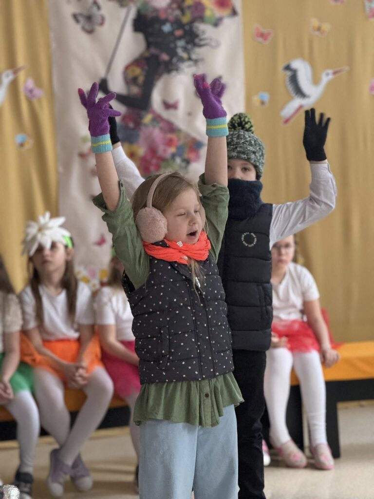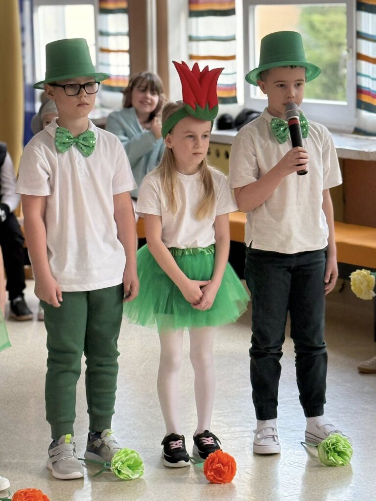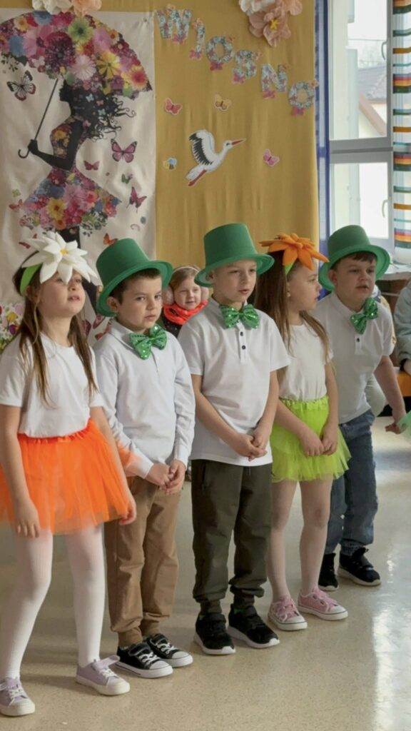 Dzisiejsze spotkanie należało do aktorów z klas pierwszych. Wspaniale zaprezentowali wiersze i piosenki żegnające zimę, a witające wiosnę. Kolorowe stroje, kwiatowe ozdoby i zielone kapelusze dodały wiosennego nastroju młodym aktorom.