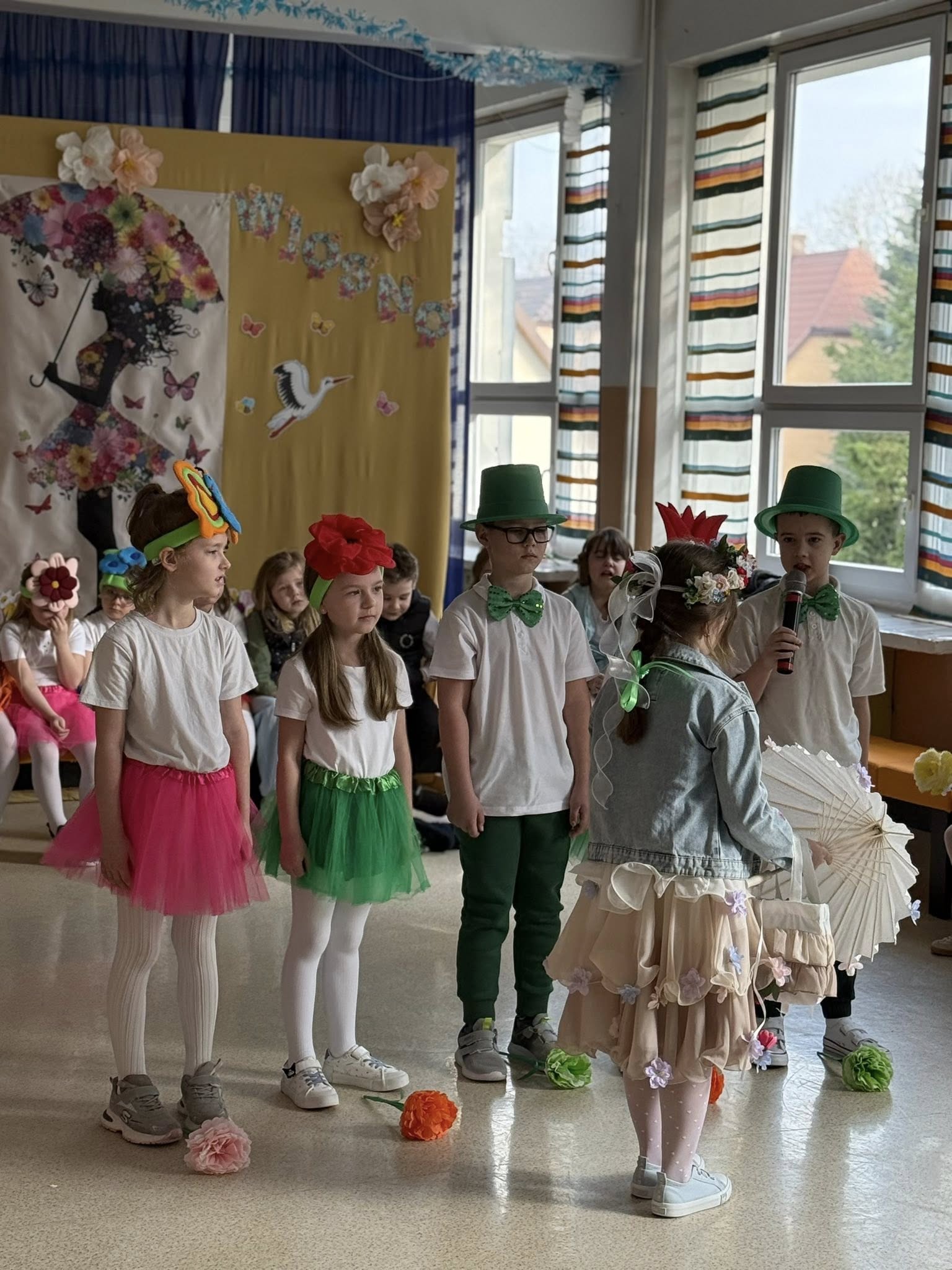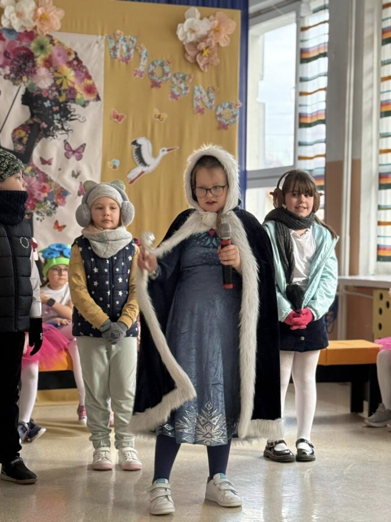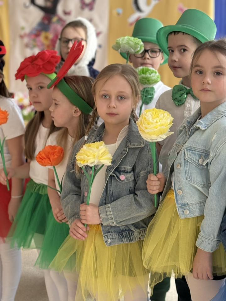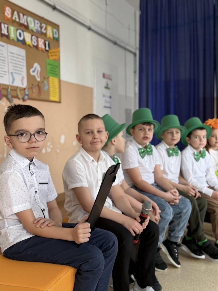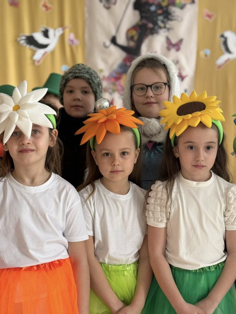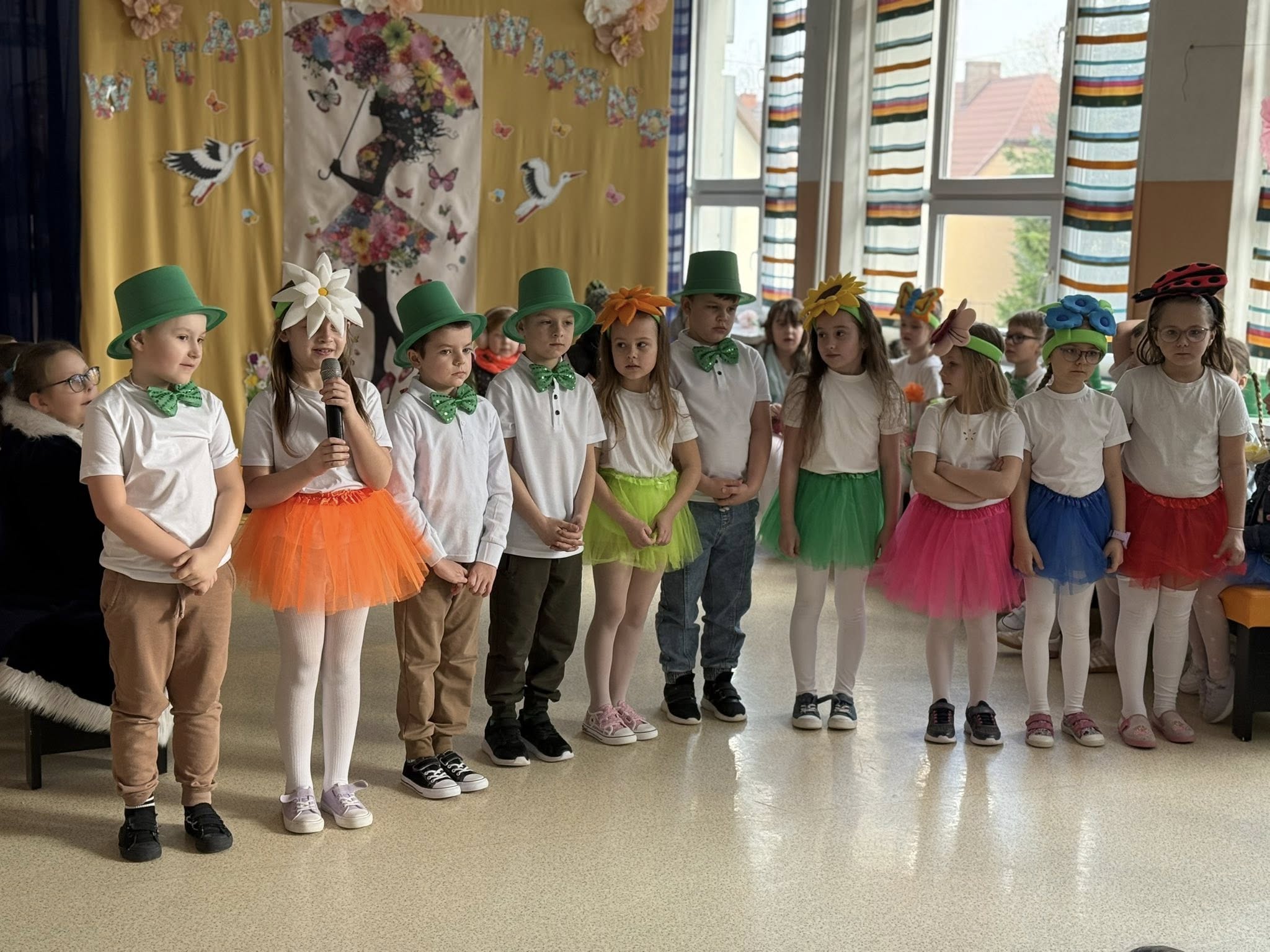 Dzisiejsze spotkanie należało do aktorów z klas pierwszych. Wspaniale zaprezentowali wiersze i piosenki żegnające zimę, a witające wiosnę. Kolorowe stroje, kwiatowe ozdoby i zielone kapelusze dodały wiosennego nastroju młodym aktorom.