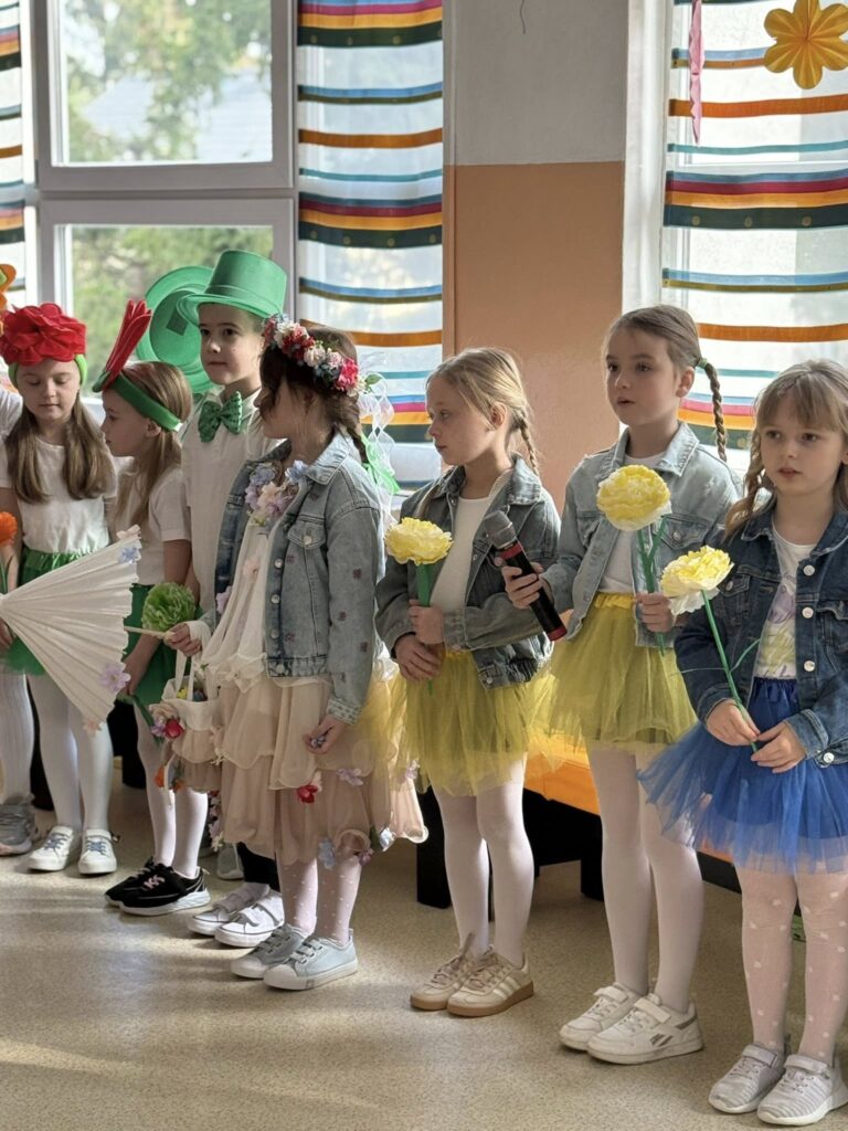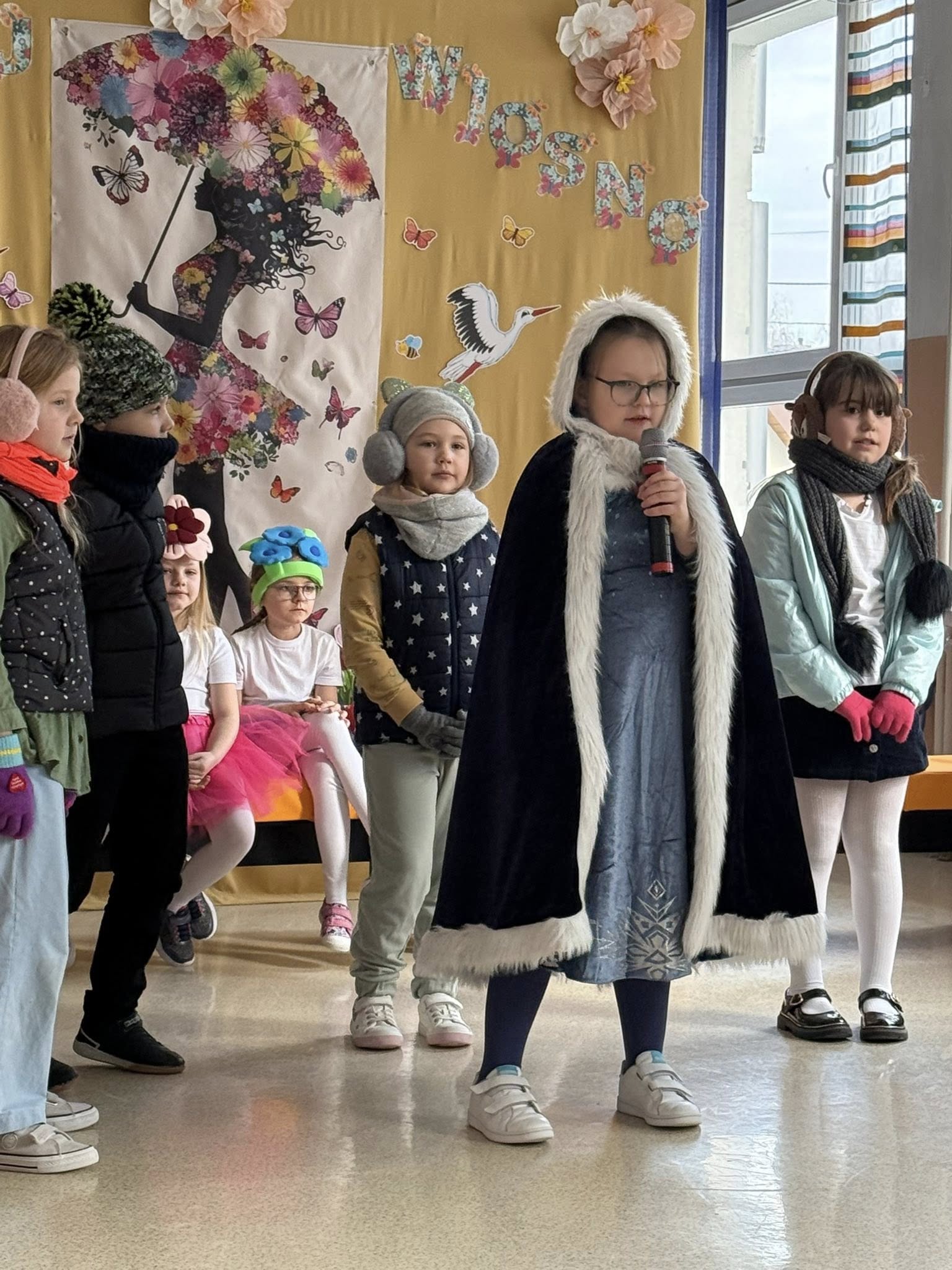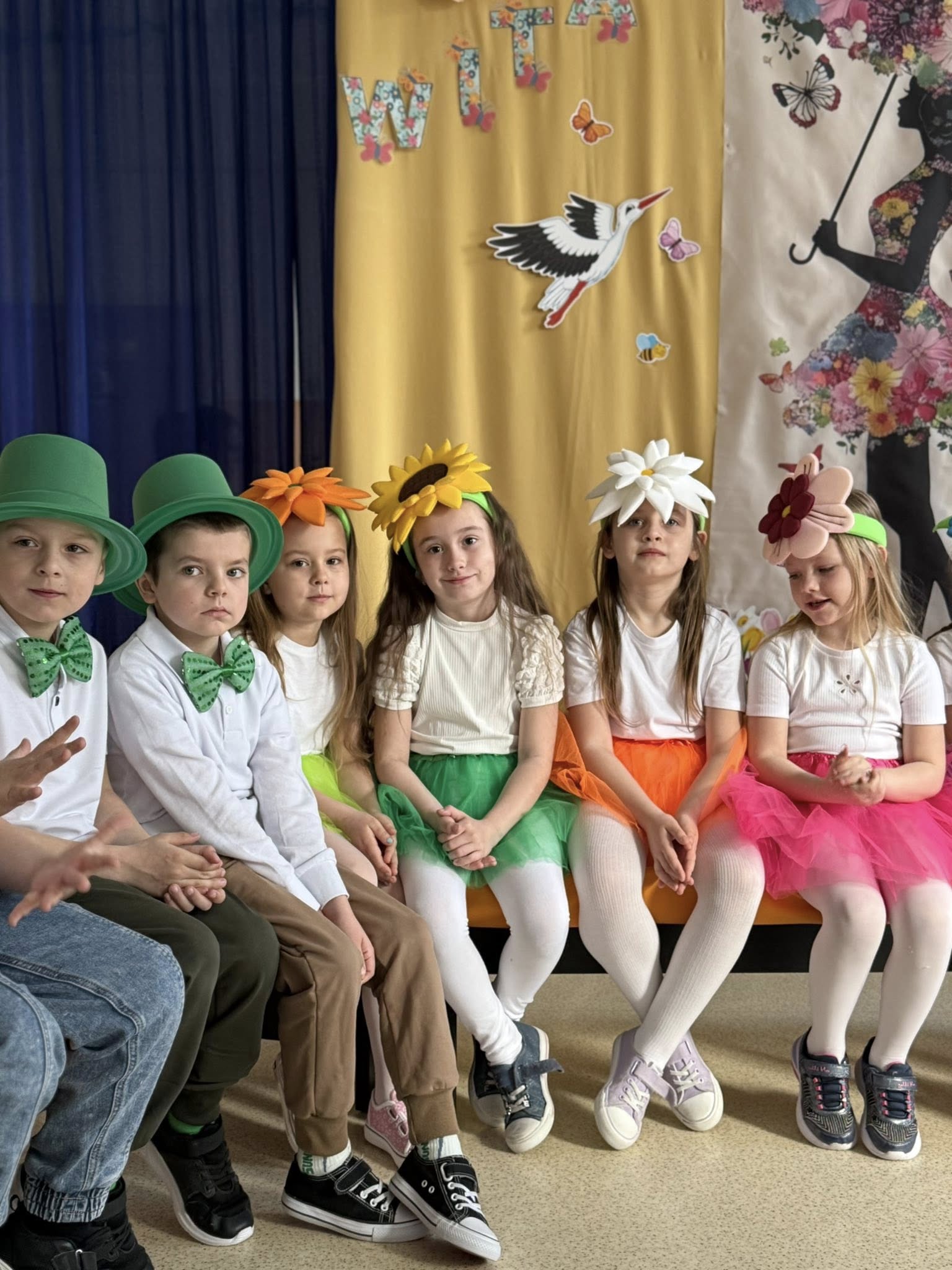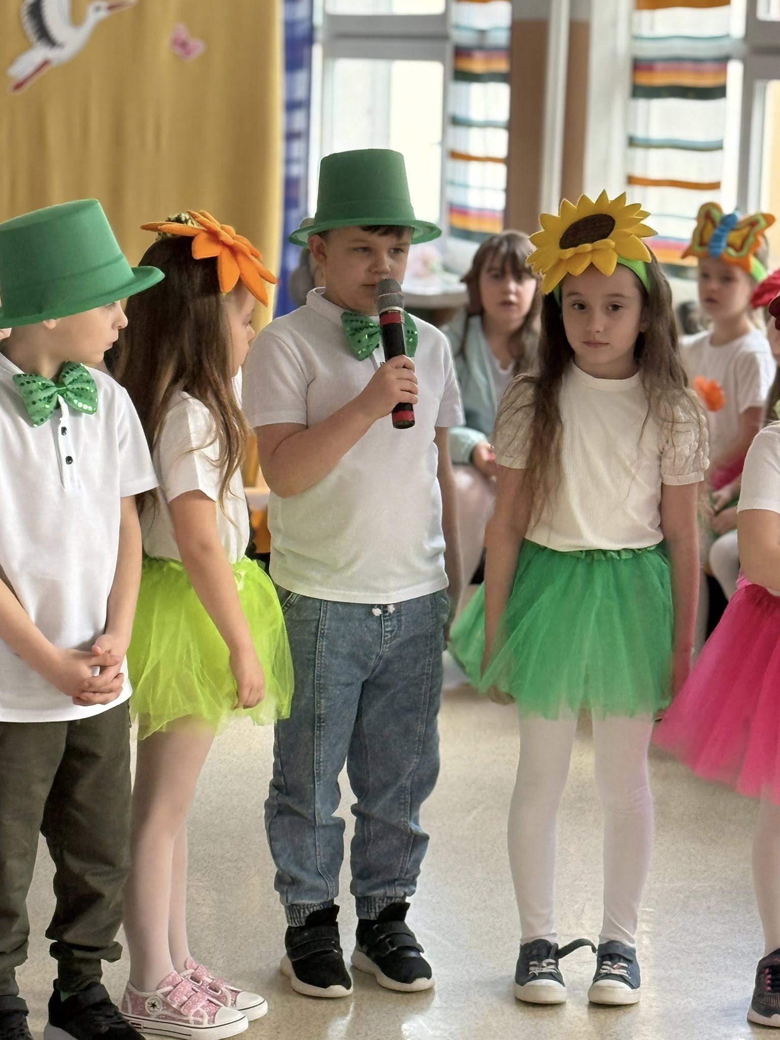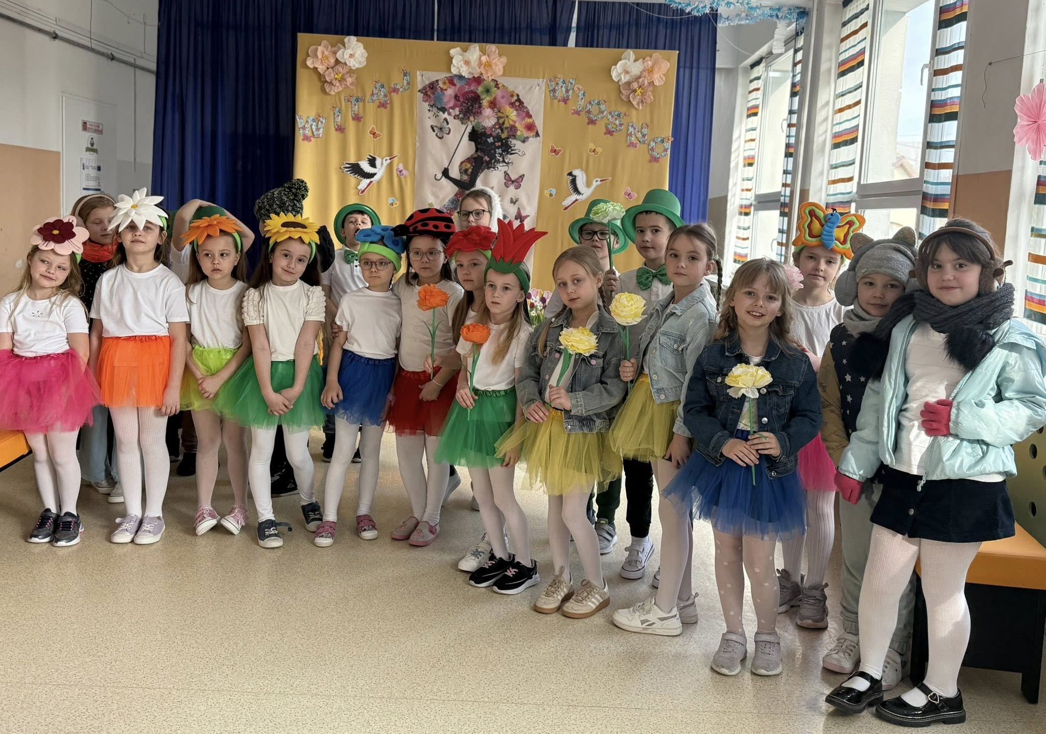 Dzisiejsze spotkanie należało do aktorów z klas pierwszych. Wspaniale zaprezentowali wiersze i piosenki żegnające zimę, a witające wiosnę. Kolorowe stroje, kwiatowe ozdoby i zielone kapelusze dodały wiosennego nastroju młodym aktorom.