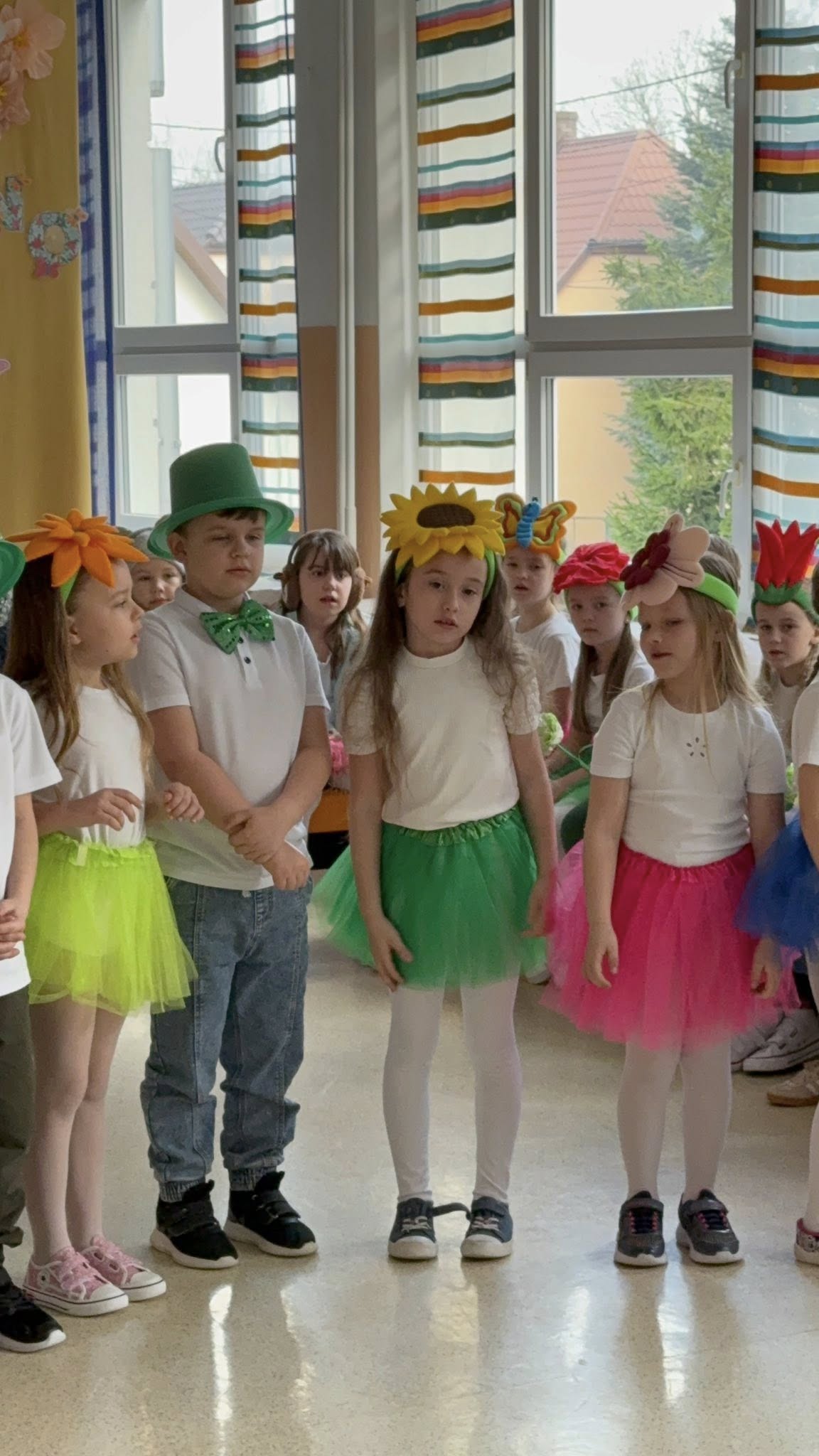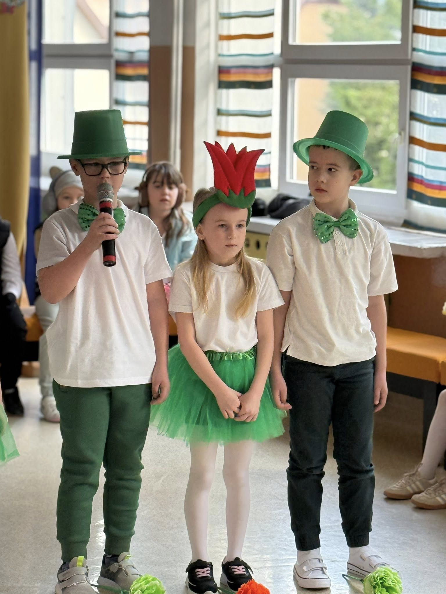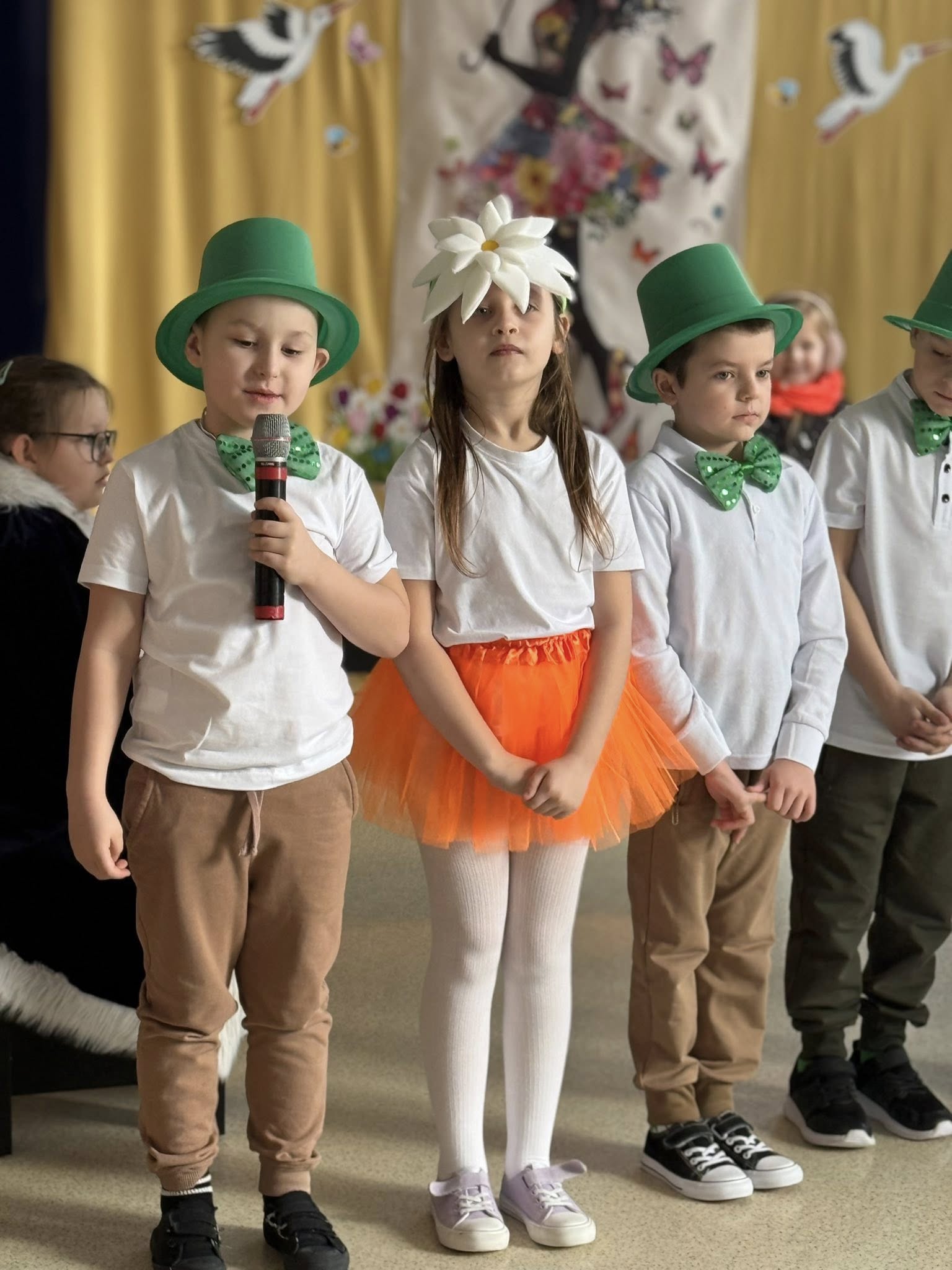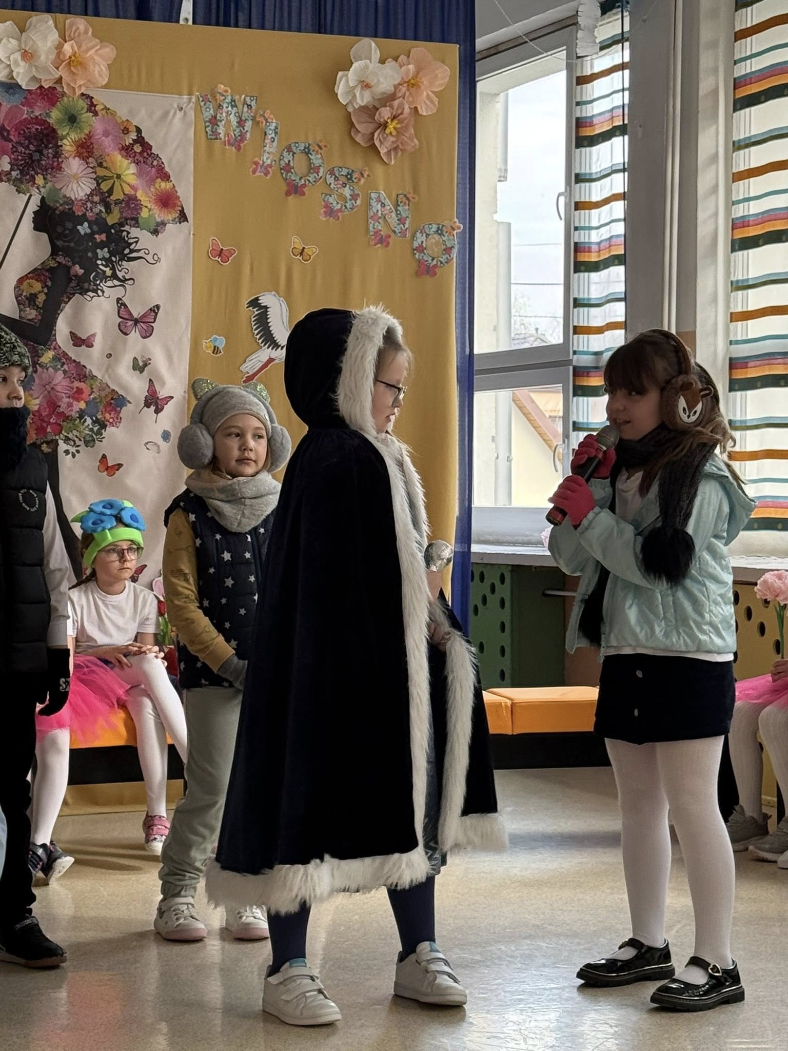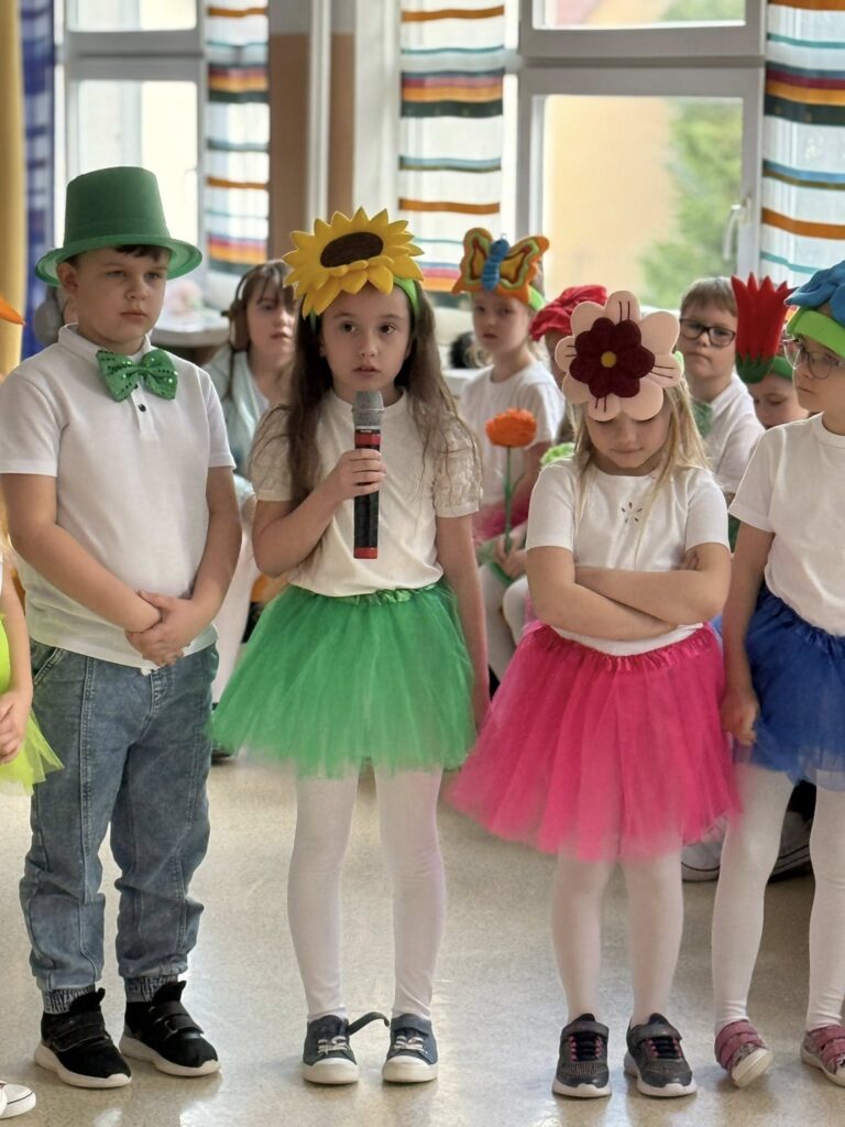 Dzisiejsze spotkanie należało do aktorów z klas pierwszych. Wspaniale zaprezentowali wiersze i piosenki żegnające zimę, a witające wiosnę. Kolorowe stroje, kwiatowe ozdoby i zielone kapelusze dodały wiosennego nastroju młodym aktorom.