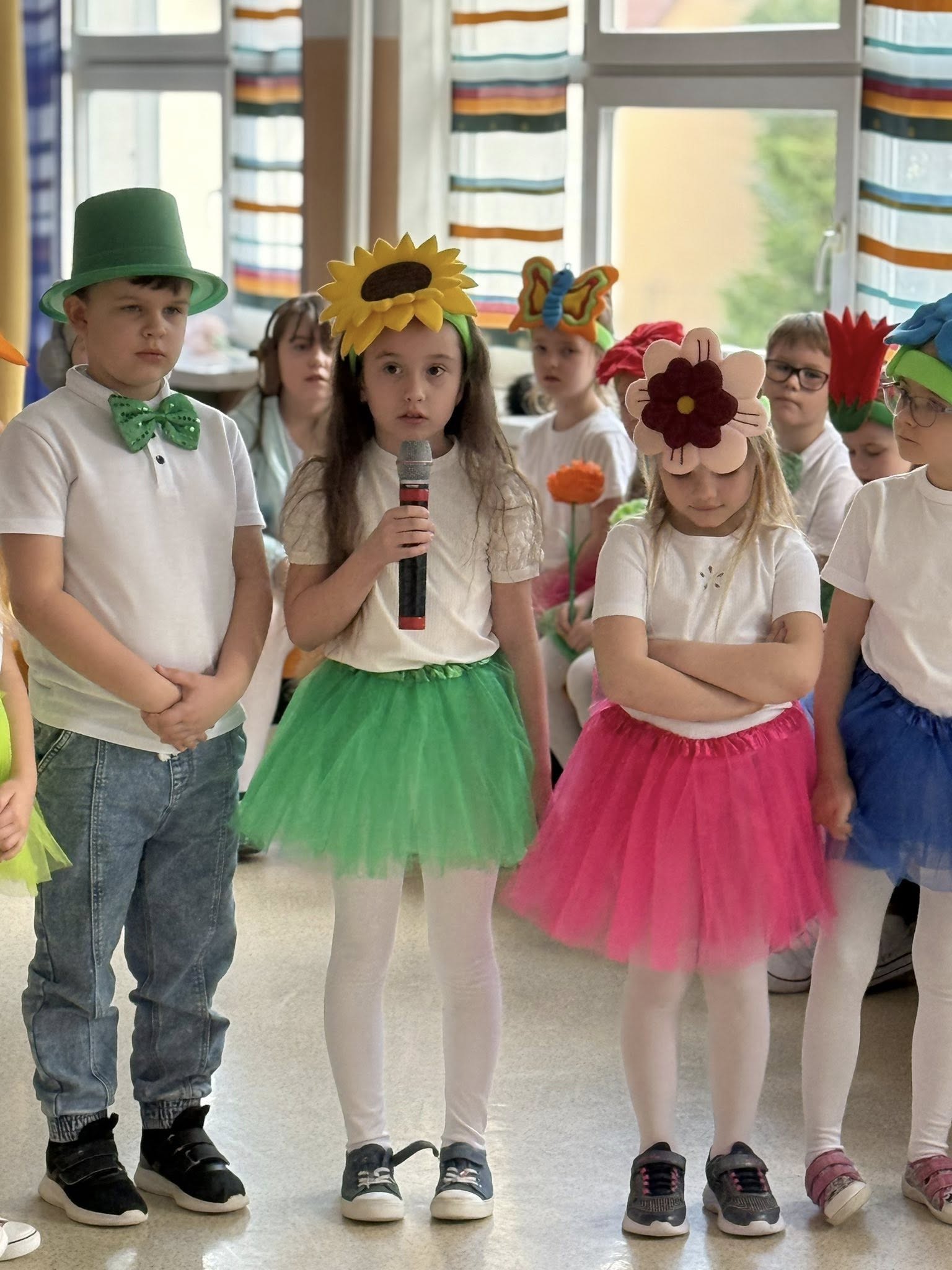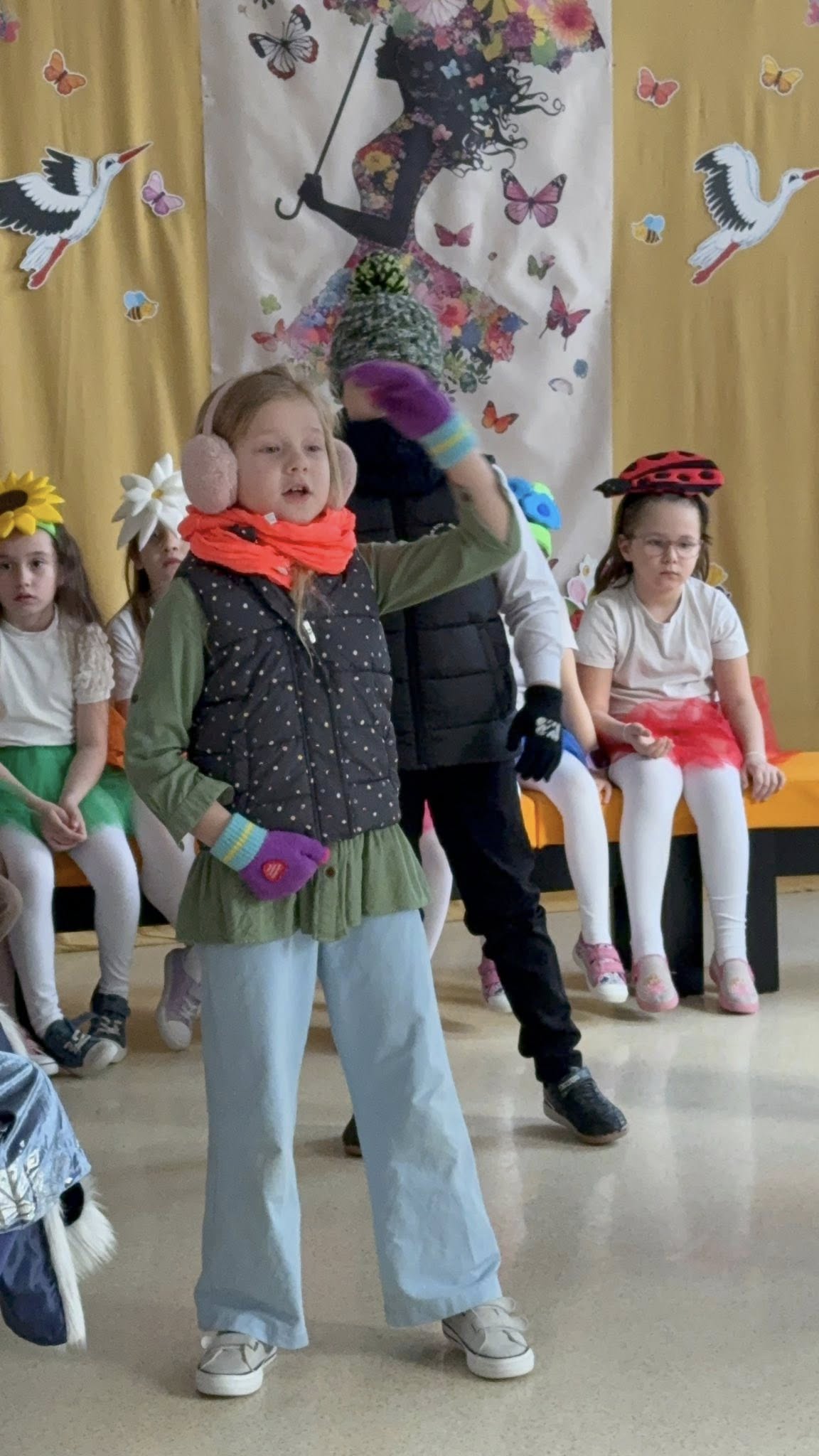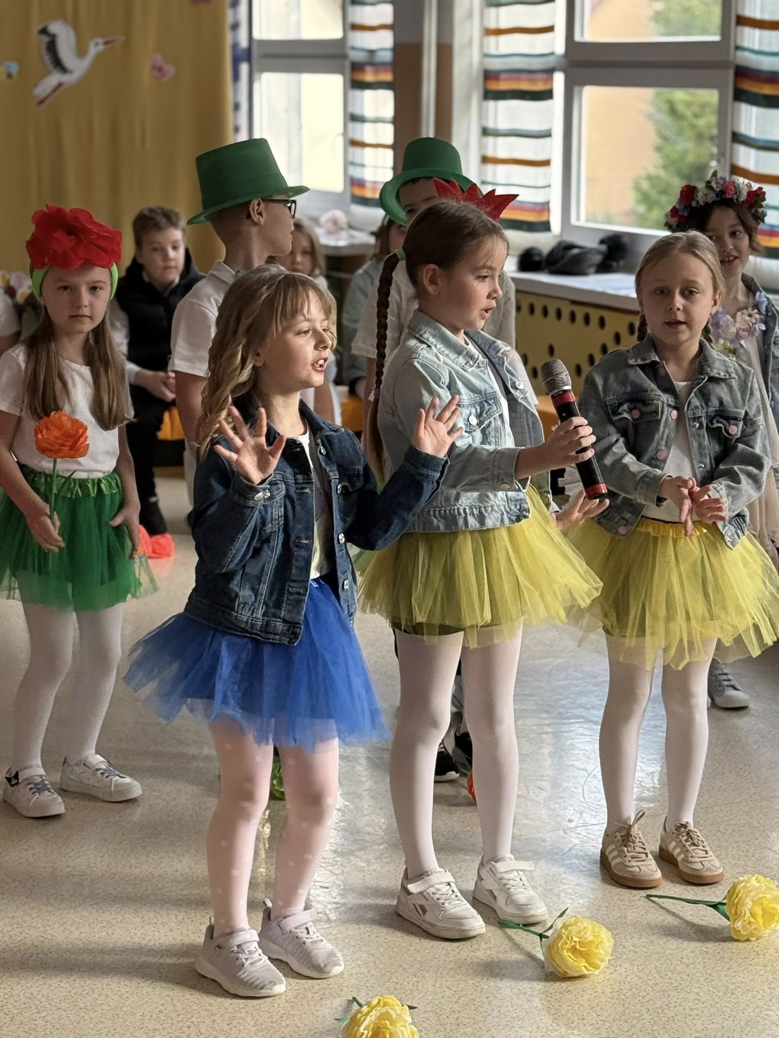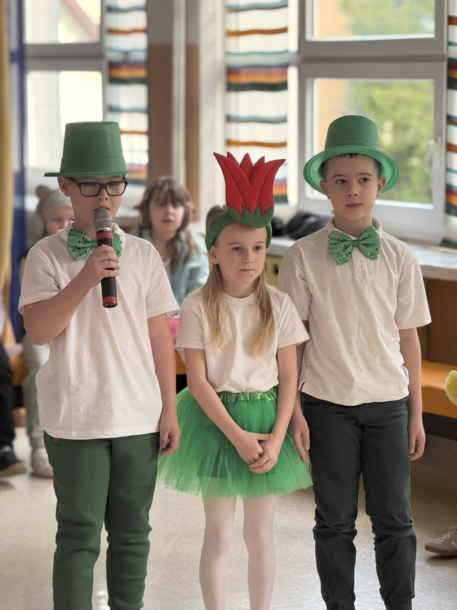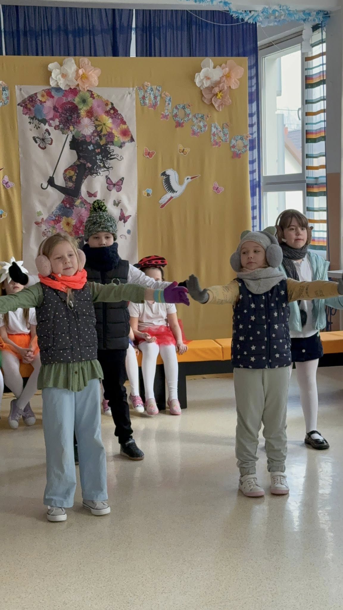 Dzisiejsze spotkanie należało do aktorów z klas pierwszych. Wspaniale zaprezentowali wiersze i piosenki żegnające zimę, a witające wiosnę. Kolorowe stroje, kwiatowe ozdoby i zielone kapelusze dodały wiosennego nastroju młodym aktorom.