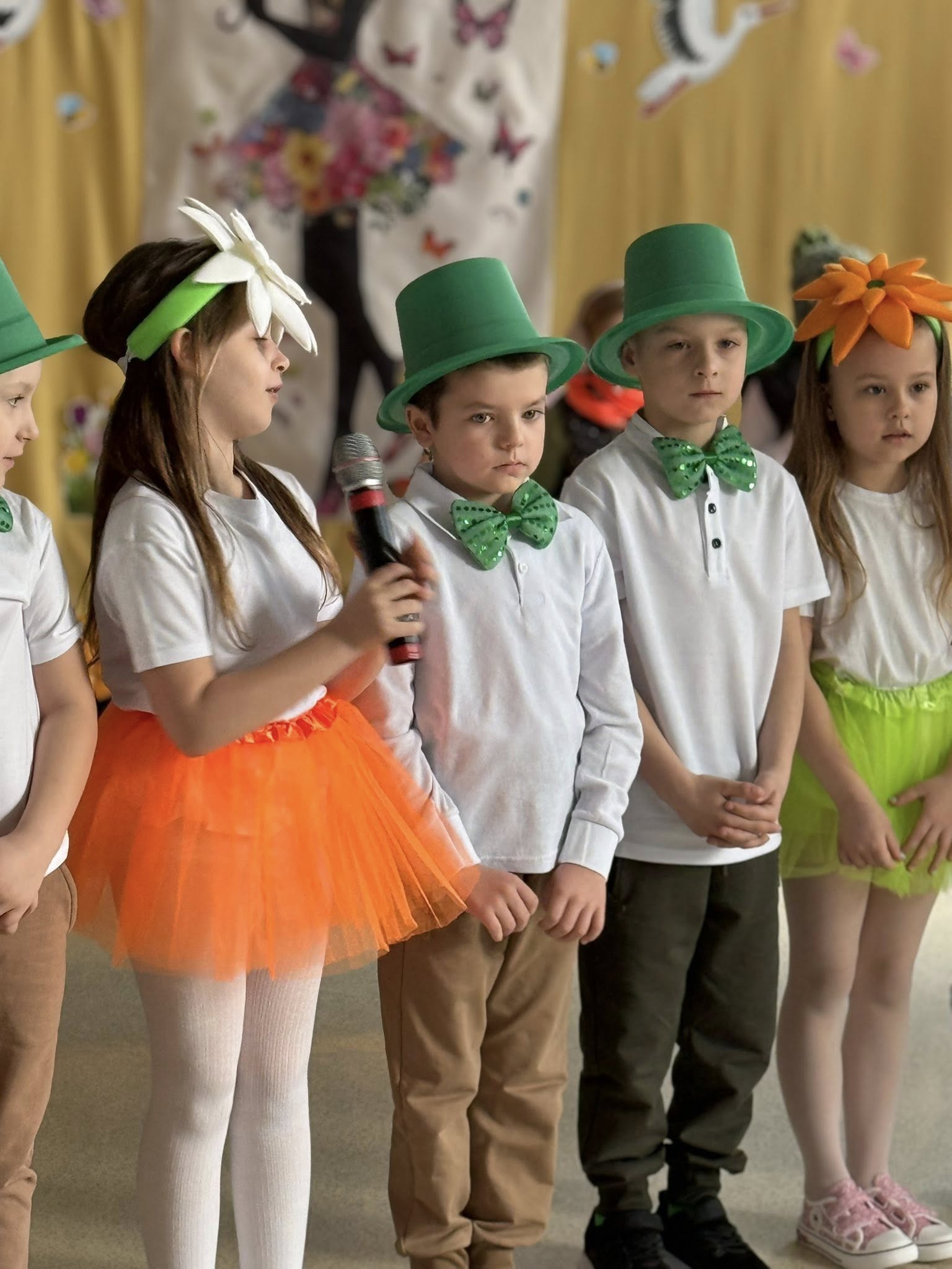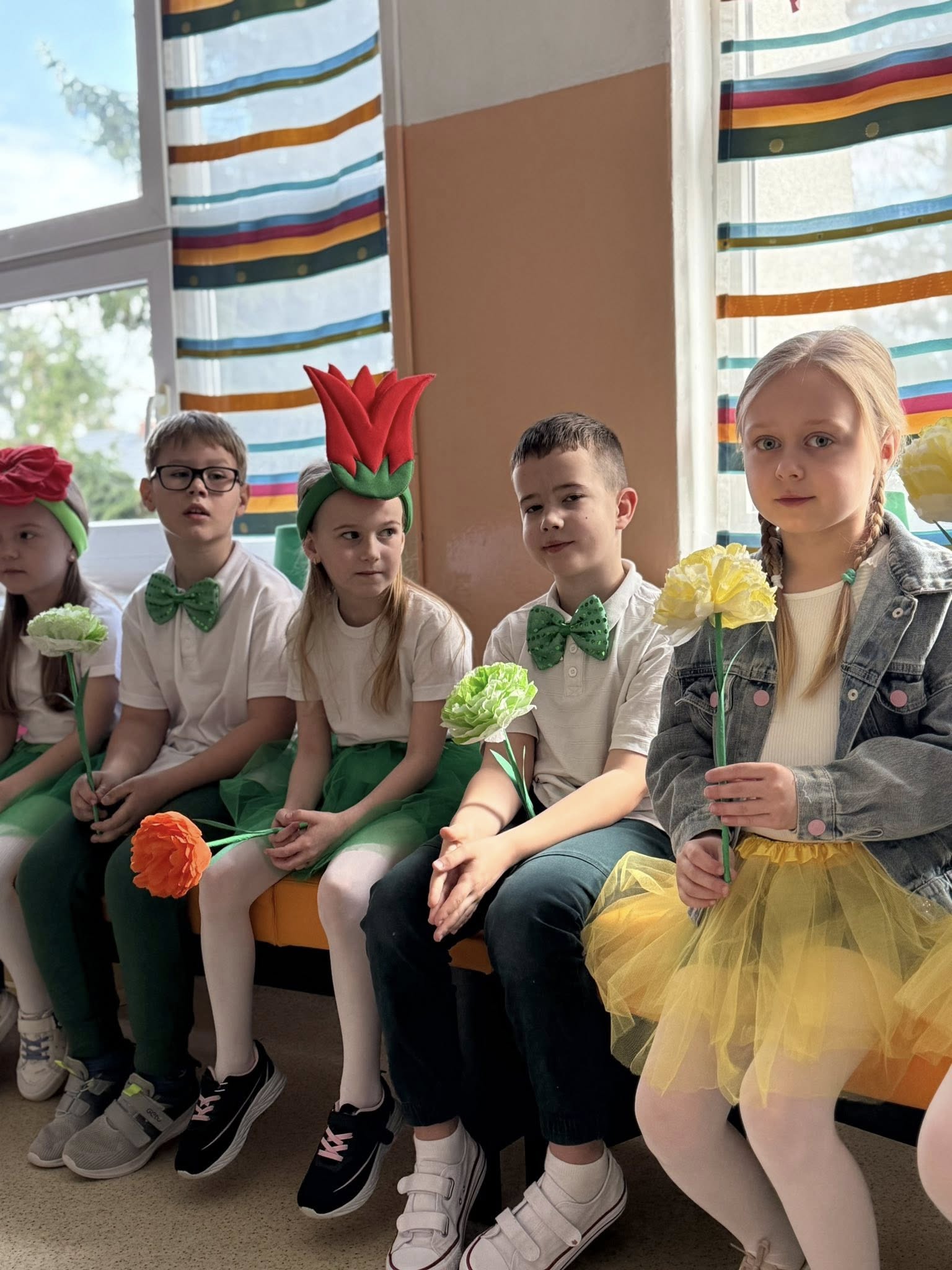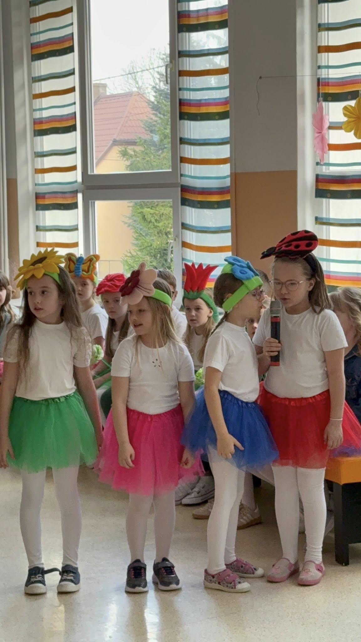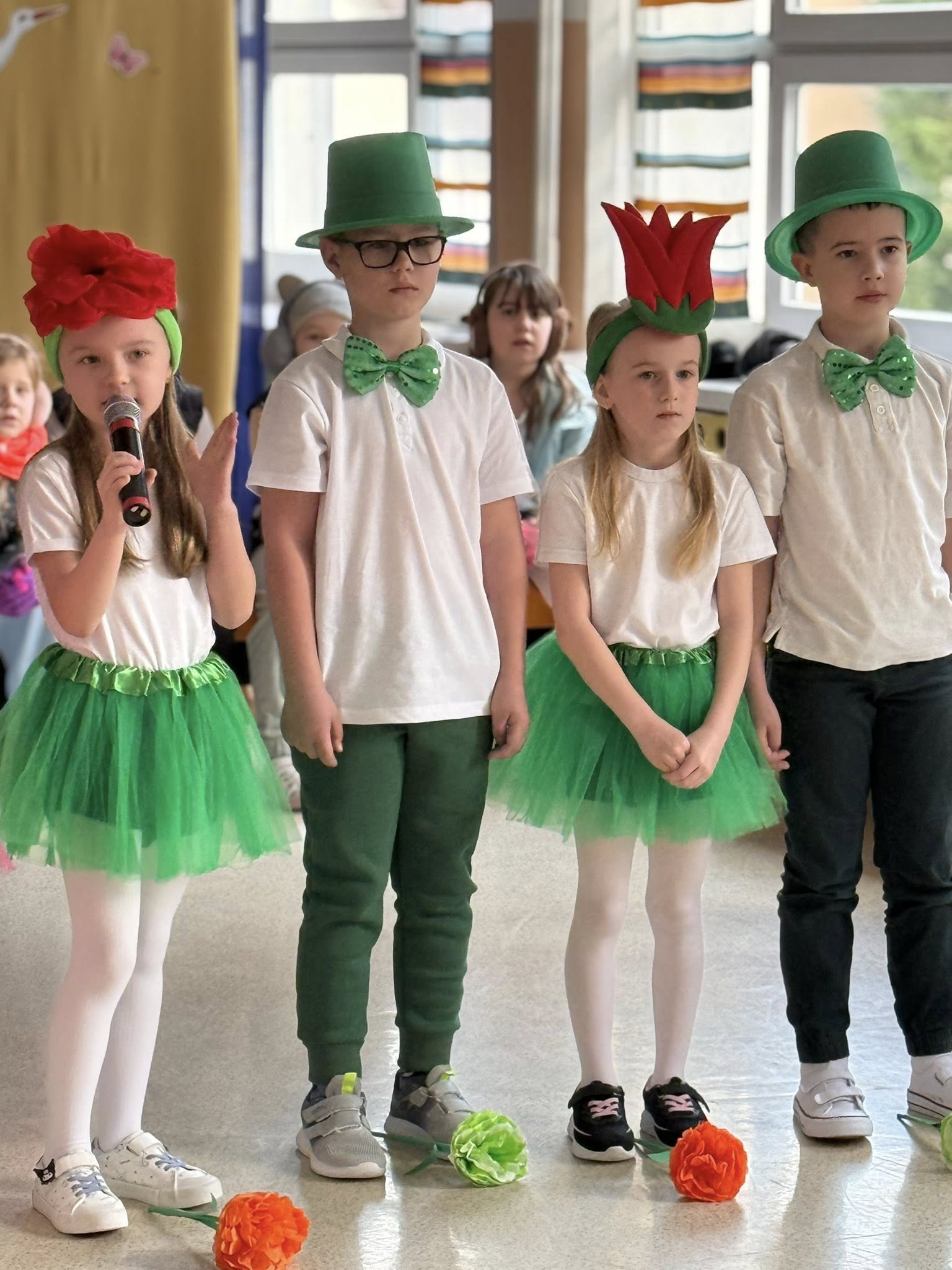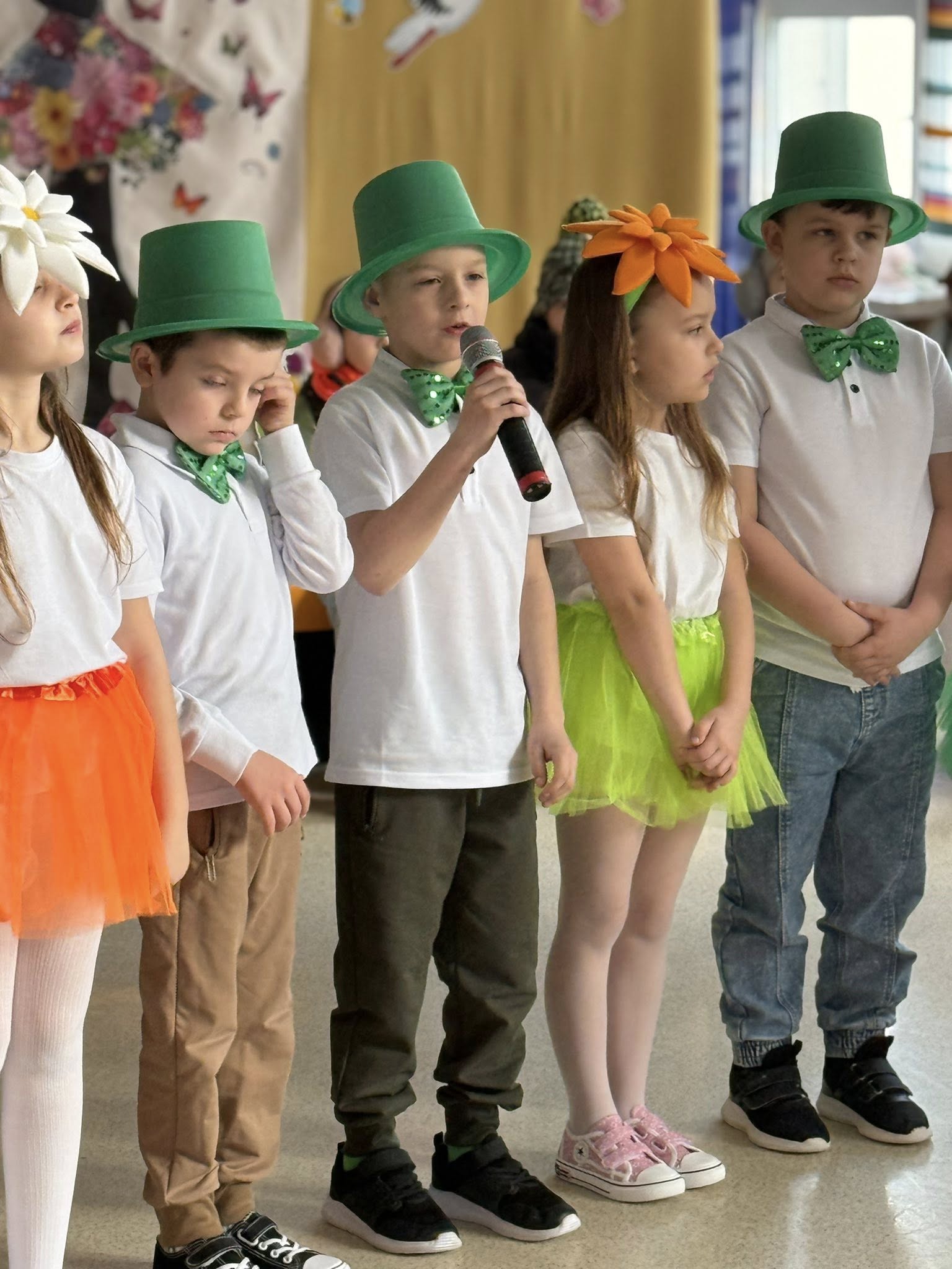 Dzisiejsze spotkanie należało do aktorów z klas pierwszych. Wspaniale zaprezentowali wiersze i piosenki żegnające zimę, a witające wiosnę. Kolorowe stroje, kwiatowe ozdoby i zielone kapelusze dodały wiosennego nastroju młodym aktorom.