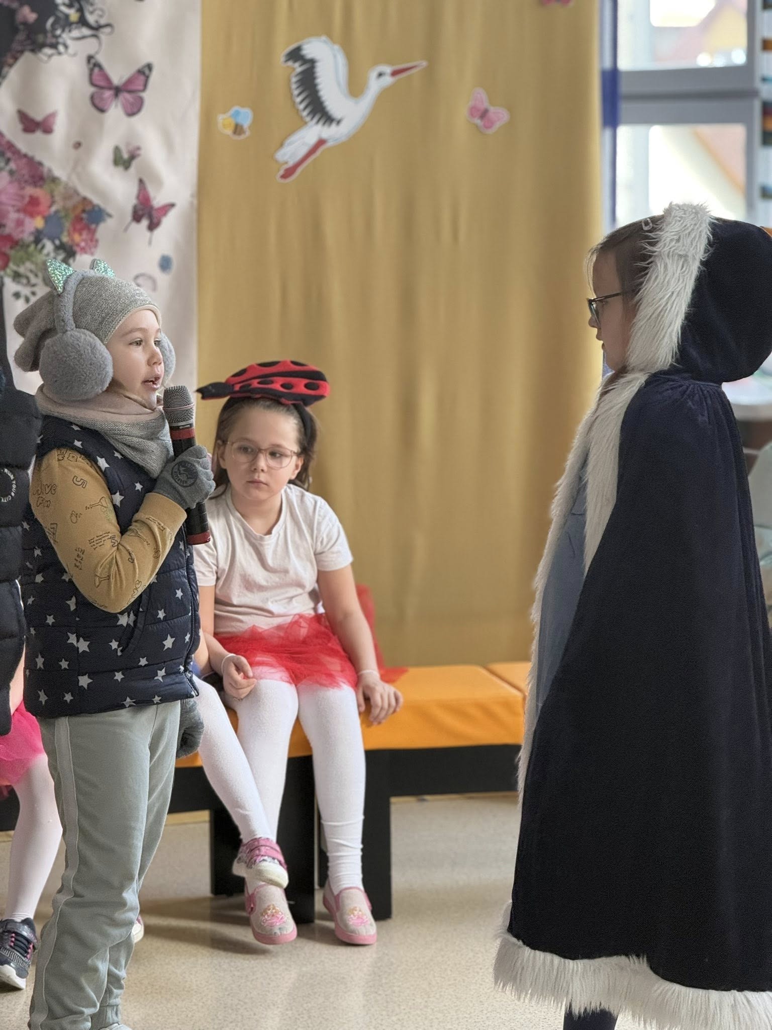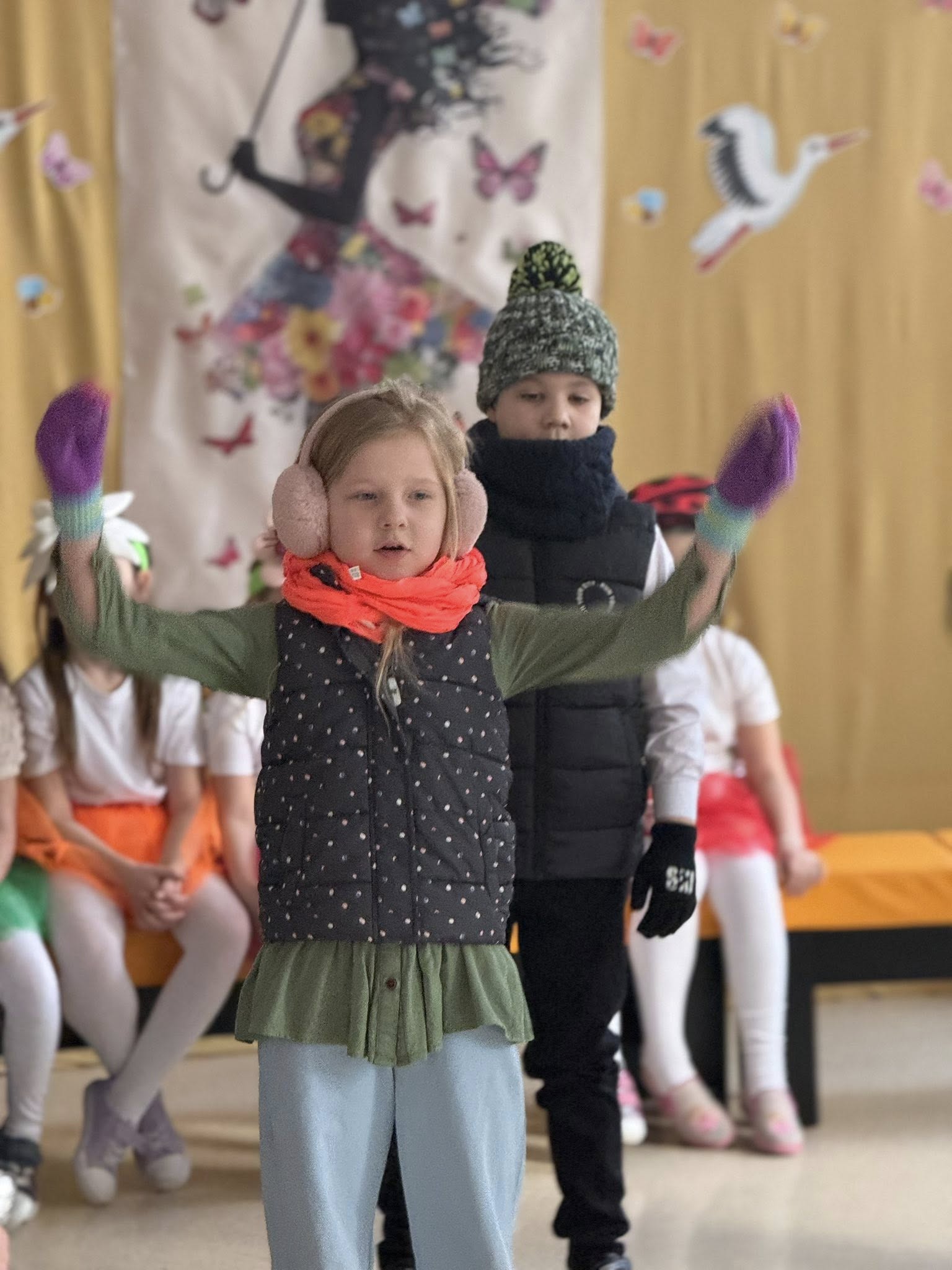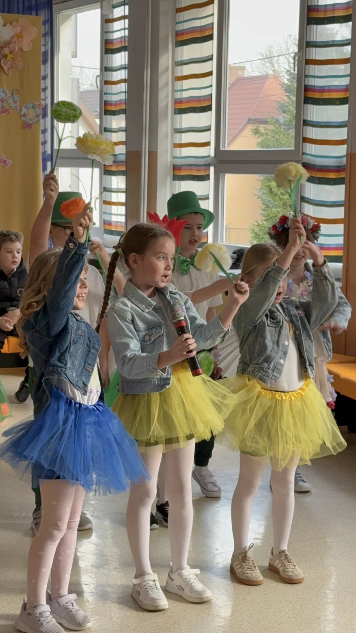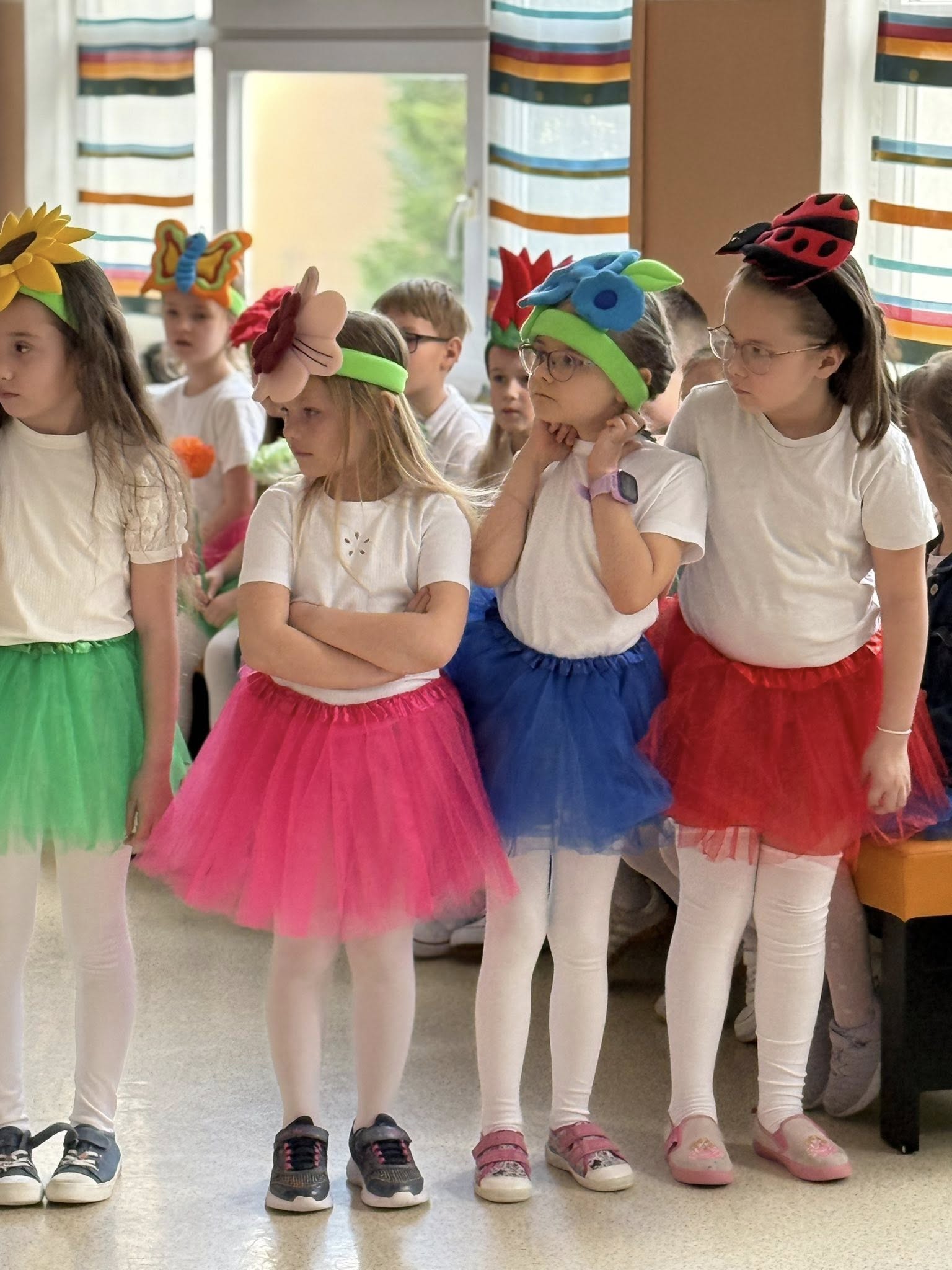 Dzisiejsze spotkanie należało do aktorów z klas pierwszych. Wspaniale zaprezentowali wiersze i piosenki żegnające zimę, a witające wiosnę. Kolorowe stroje, kwiatowe ozdoby i zielone kapelusze dodały wiosennego nastroju młodym aktorom.